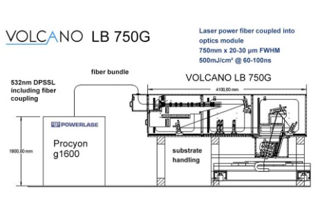 High power green (532nm) DPSSL light is provided by fibers to the line beam optics module G-version. This method allows multiplexing of laser light sources and obtaining an energy density of >=500m J/cm² in a 750mm long line. The energy density in this line geometry converts 50-70nm a-Si films into p-Si for the manufacturing of LCD-TFT back plates.